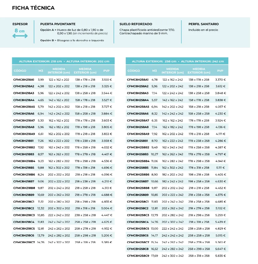 Fabricadas con un sistema de paneles sandwich formado por dos soportes metálicos con espuma rígida de poliuretano entre ellos (densidad 40 ± 2 Kg/m³), disponible en 2 grosores: